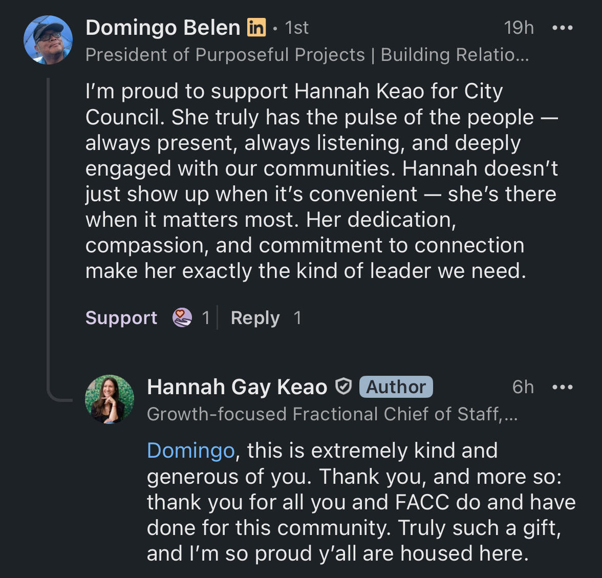 I’m Hannah Gay Keao. I was appointed to Edgewater, Colorado’s City Council in April 2021, ran to keep my seat and won in November 2021, and am thrilled for the opportunity to continue serving my neighbors. In late 2020, my husband Brandon and I welcomed our first child, and are expecting our second in December 2025. We all live with our rescue pup Fletcher in the Rose Acres neighborhood on the west side of town.Starting as a middle school teacher on the Navajo Reservation, I have spent my career changing outcomes for marginalized communities and opening gates wider for those who don’t have access.I previously sat on the Board of Directors for the Edgewater Collective and served on our city’s Sustainability Board. I have worked across our community with all political affiliations (Democrat, Republican, Independent, Libertarian and Green–and maybe more!) to activate meaningful policies and practices for our community. Brandon and I are so grateful we chose Edgewater as our home, and it is my job as a Councilwoman to ensure that all my neighbors of varying incomes, backgrounds, and identities feel just as welcome and supported by our special community.